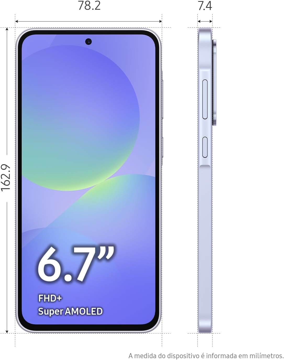 Para quem não abre mão de desempenho, o processador Snapdragon 6 Gen 3 (4nm) aliado a uma câmara de vapor aprimorada garante que o aparelho rode jogos e aplicativos pesados sem engasgos. A experiência visual é elevada ao máximo com a tela Super AMOLED de 6.7 polegadas. Graças ao Vision Booster, você terá brilho e contraste perfeitos mesmo sob a luz direta do sol, tudo com a fluidez das bordas finas e um design elegante na cor Violeta.