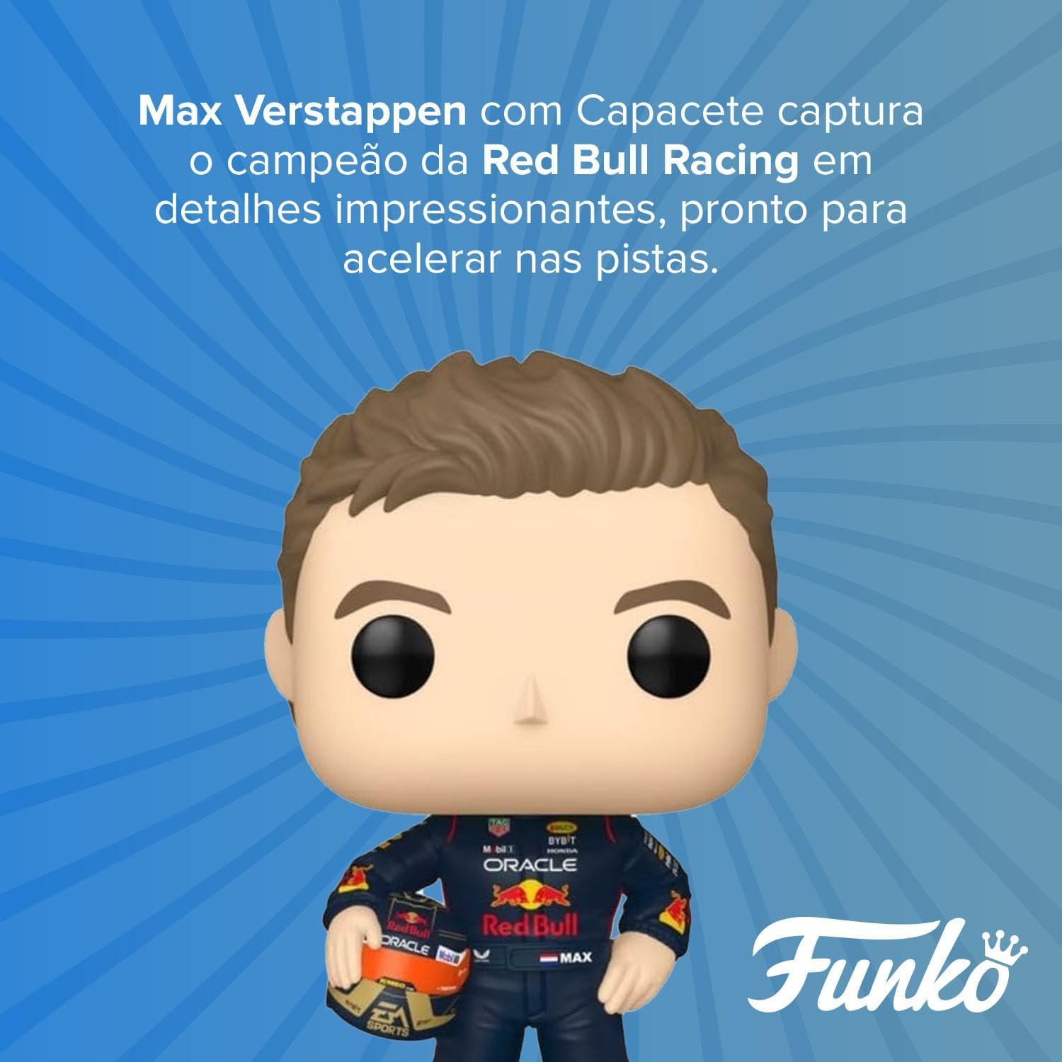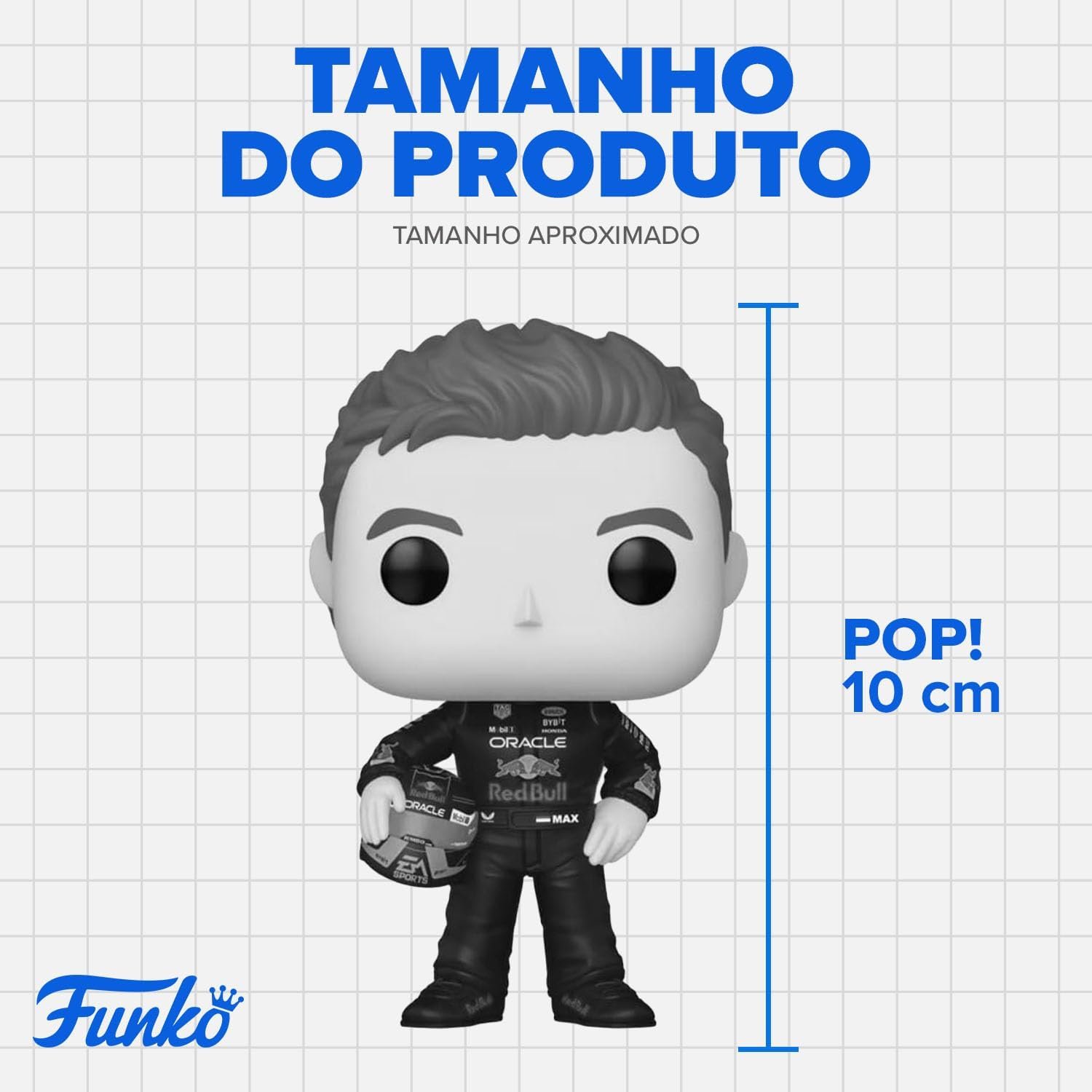 UMA LENDA DAS PISTAS. Com aproximadamente 10 cm de altura, o Funko Pop! Max Verstappen com Capacete captura o campeão da Red Bull Racing em detalhes impressionantes, pronto para acelerar nas pistas e na sua coleção.