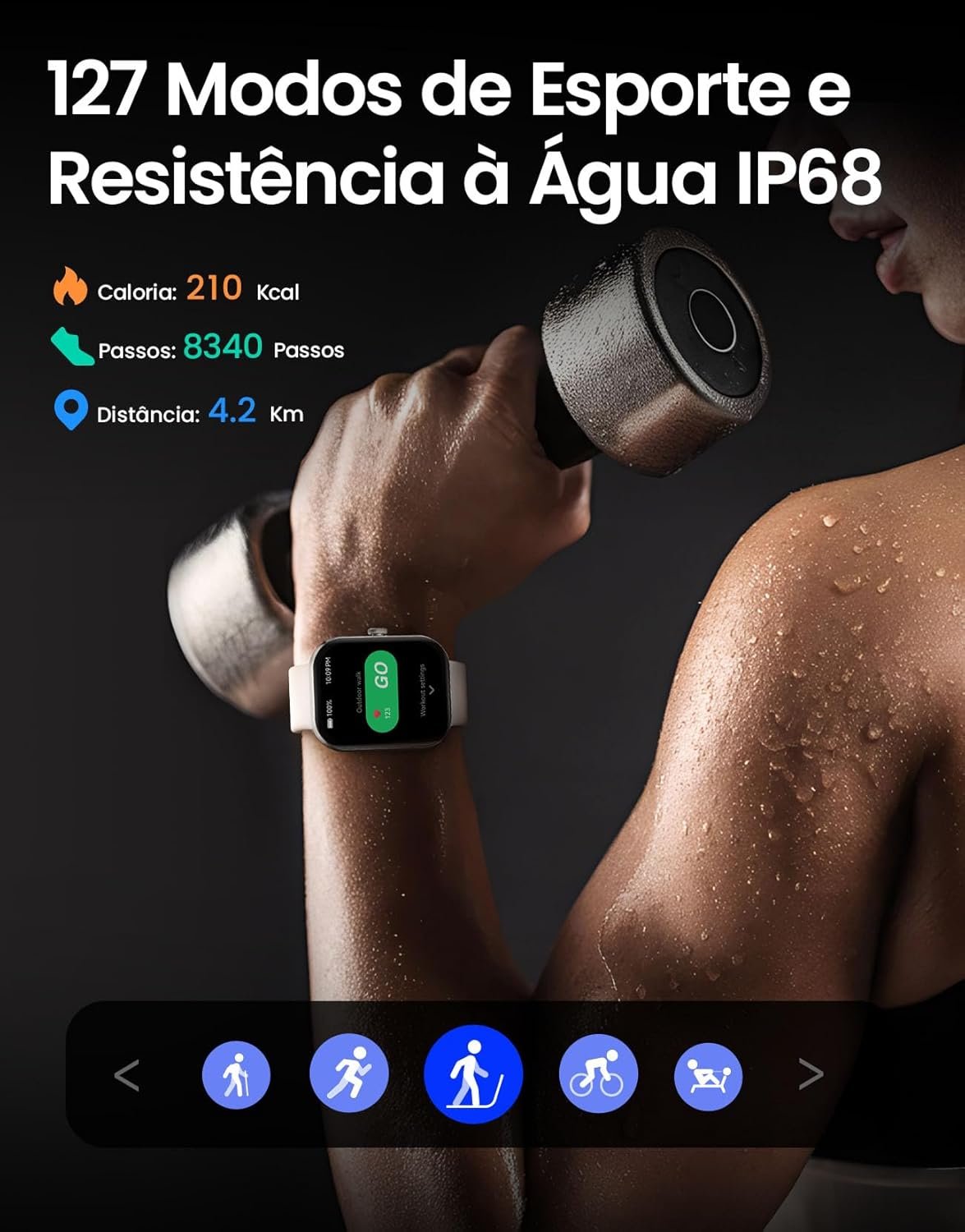 127+ Modos de Esporte e Compatibilidade com Strava: Acompanhe seus treinos com mais de 127 modos de esporte, garantindo coleta precisa de dados para cada atividade. Sincronize com o Strava para monitorar seu progresso físico e compartilhar suas conquistas.