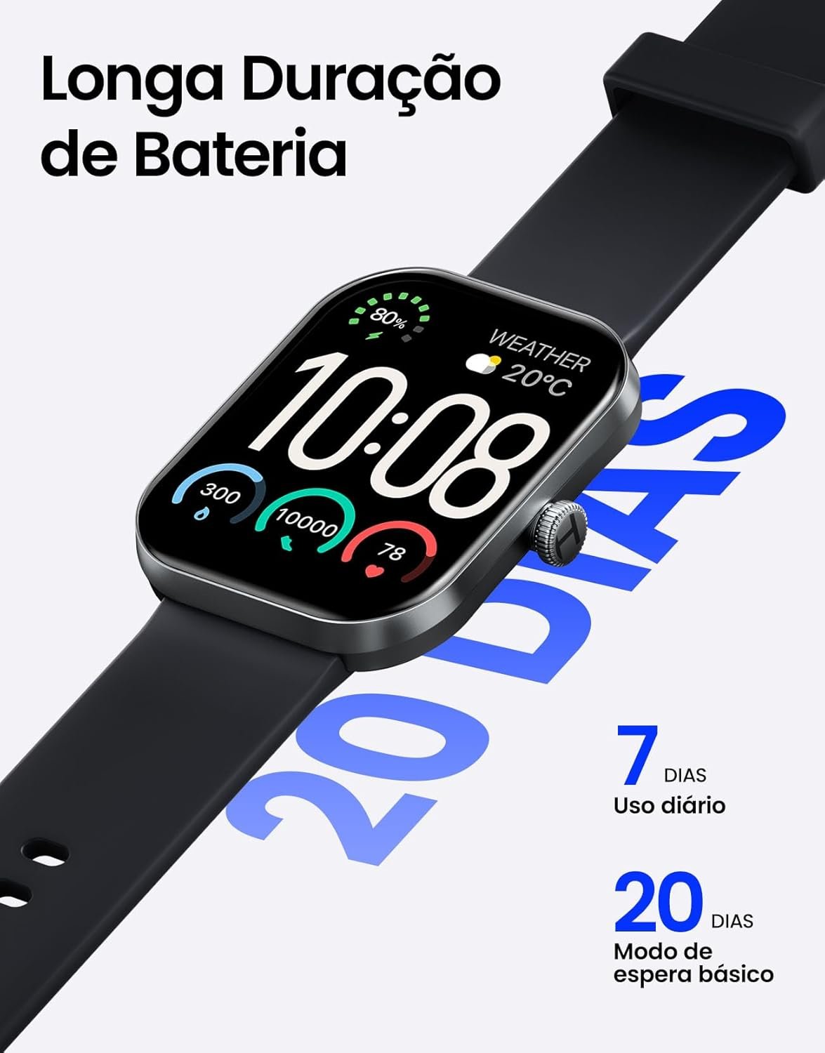 Longa Duração da Bateria e Certificação IP68: Aproveite até 7 dias de autonomia na moda diária e até 20 dias no modo básico. Com a certificação IP68 à prova d’água, este smartwatch é perfeito para o uso diário e atividades ao ar livre, resistente até mesmo à água.