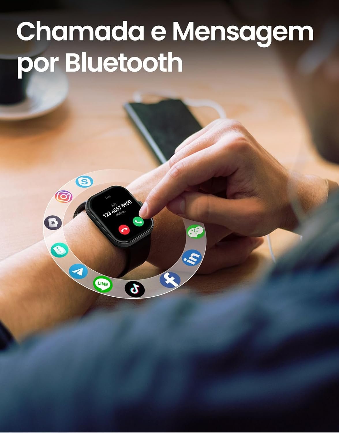 Chamada por Bluetooth:O smartwatch possui um microfone integrado, permitindo fazer e receber chamadas por Bluetooth diretamente do relógio, oferecendo conveniência sem as mãos em qualquer lugar.