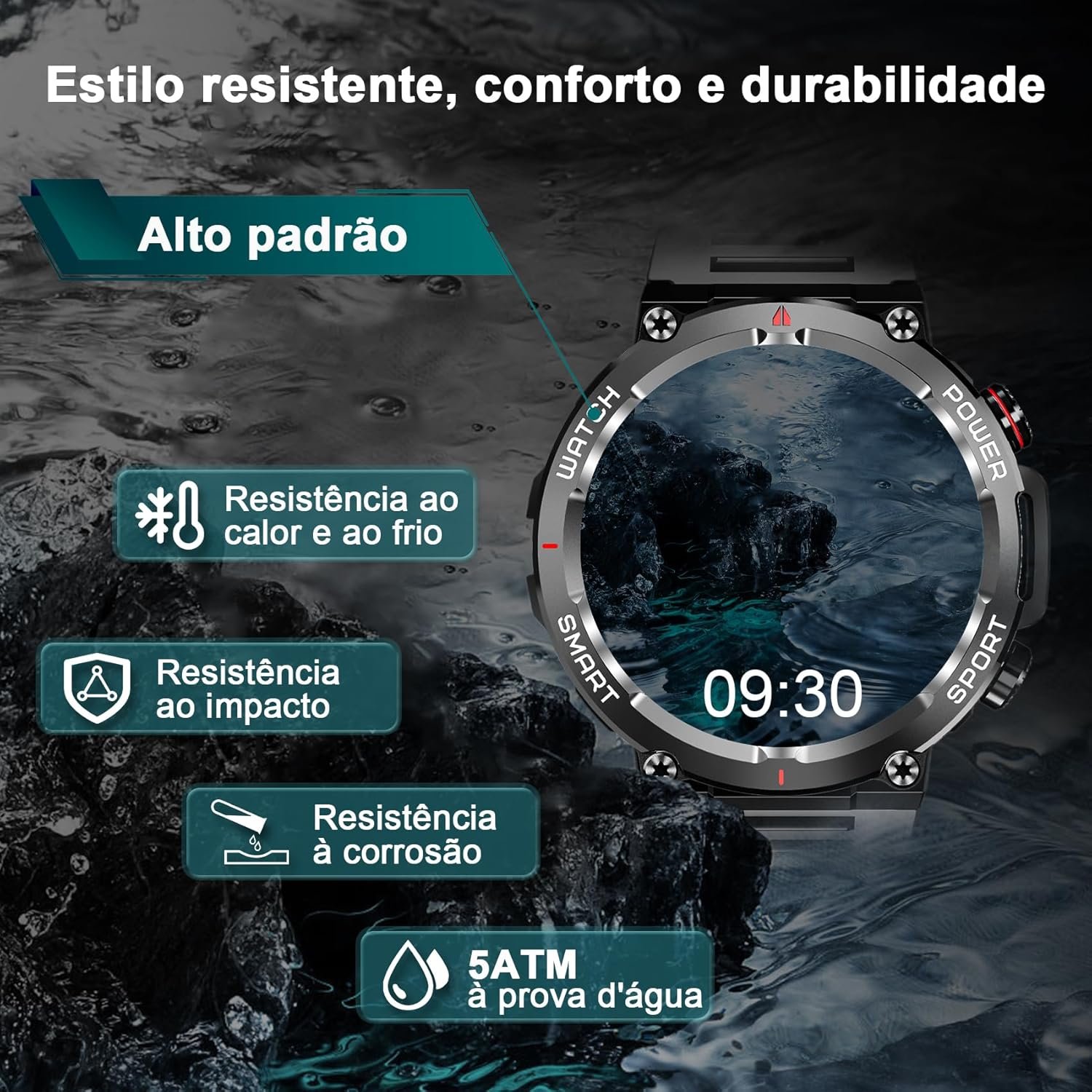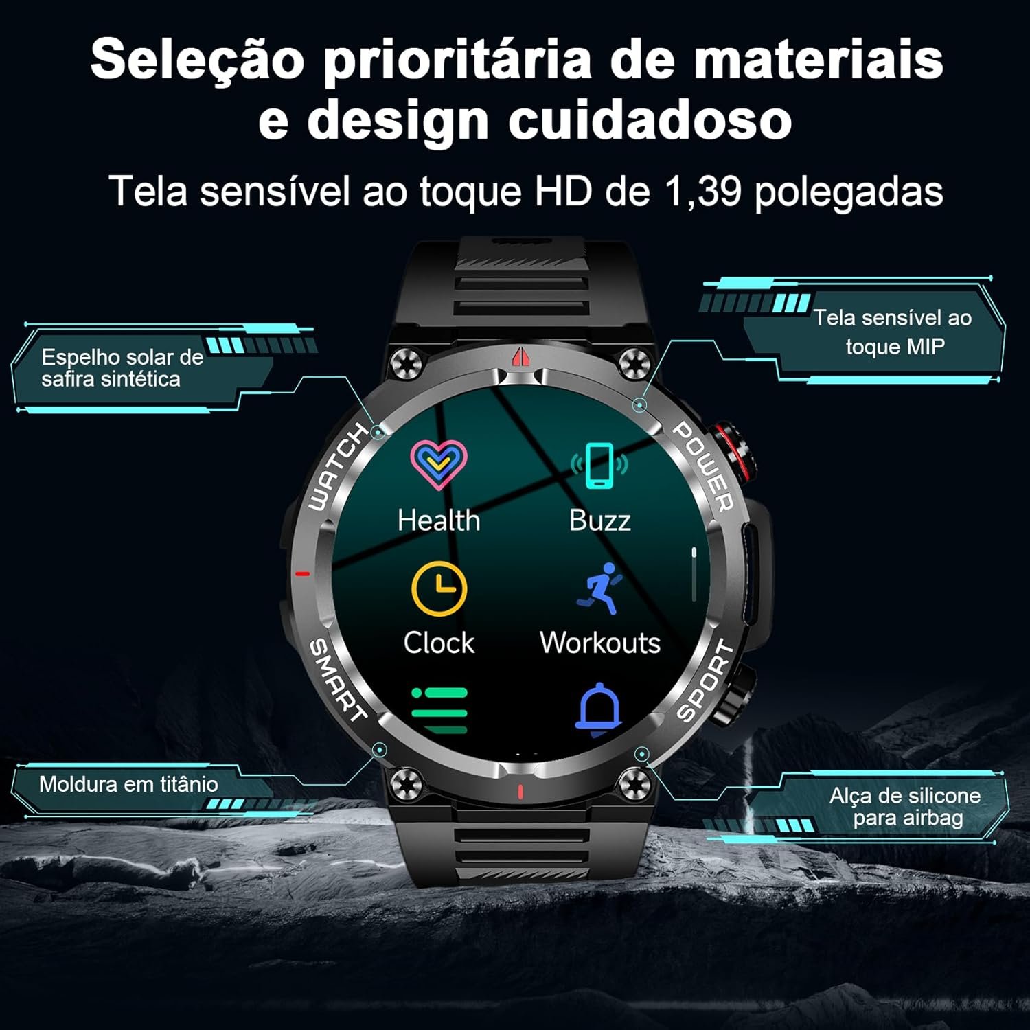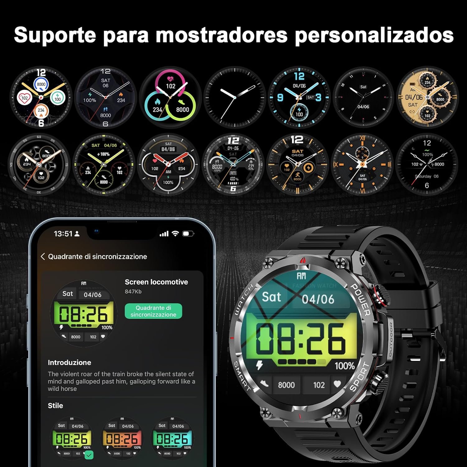 【Relógio Esportivo Resistente para Homens】 O smartwatch IOWODO W50 é protegido por uma tela de vidro resistente a arranhões, garantindo durabilidade. Este relógio esportivo robusto possui uma tela grande de 1.39” Full HD, que oferece uma exibição clara e vibrante. Com diversos mostradores online disponíveis, você pode personalizar o relógio para torná-lo único e individual. Além disso, ele vem com duas pulseiras confortáveis e hipoalergênicas (uma de silicone e outra de tecido), cujo comprimento pode ser ajustado livremente.