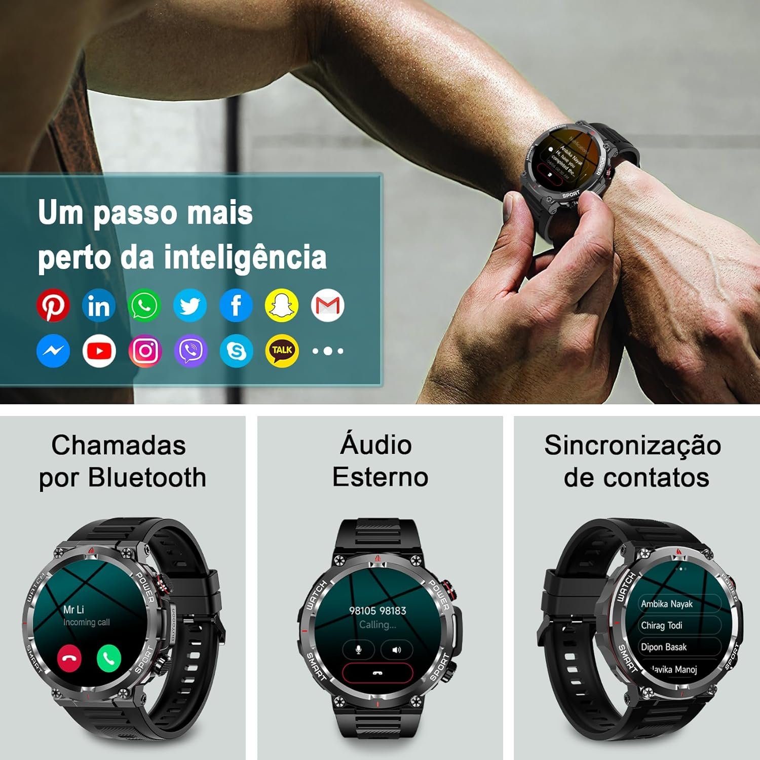 📞【Chamadas Bluetooth, Atender/Fazer】 Este smartwatch masculino suporta chamadas Bluetooth, com alto-falante e microfone de alta fidelidade para fazer e receber ligações diretamente do pulso. Ele também sincroniza contatos e histórico de chamadas do seu telefone. Quando você recebe uma chamada ou mensagem (SMS, e-mail, WhatsApp, Facebook, Instagram, etc.), o relógio notifica em tempo real, garantindo que você nunca perca nada importante.